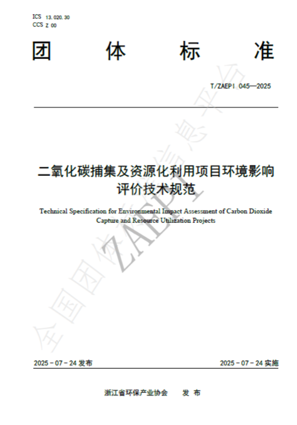 2025年7月24日,由浙江省環(huán)保集團生態(tài)環(huán)保研究院牽頭制定的《二氧化碳捕集及資源化利用項目環(huán)境影響評價技術規(guī)范》(T/ZAEPI 045-2025)團體標準正式發(fā)布并實施。該標準由浙江省環(huán)保產業(yè)協(xié)會歸口管理,聯(lián)合省內多家環(huán)保領域骨干企業(yè)共同起草,填補了工業(yè)領域二氧化碳捕集及資源化利用項目環(huán)評技術規(guī)范的空白。